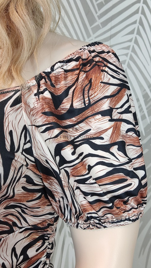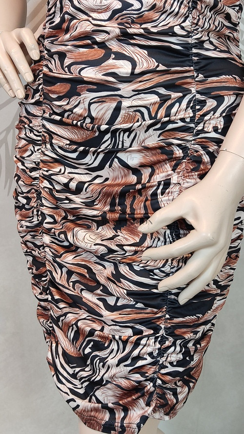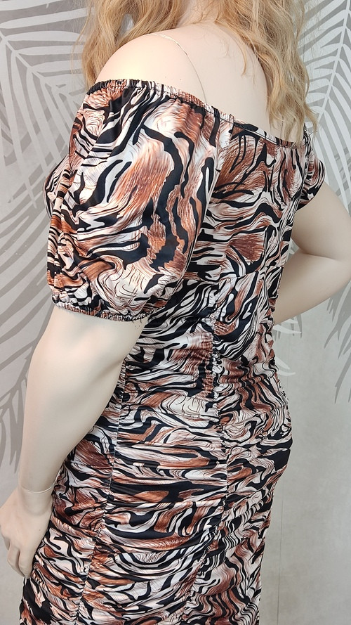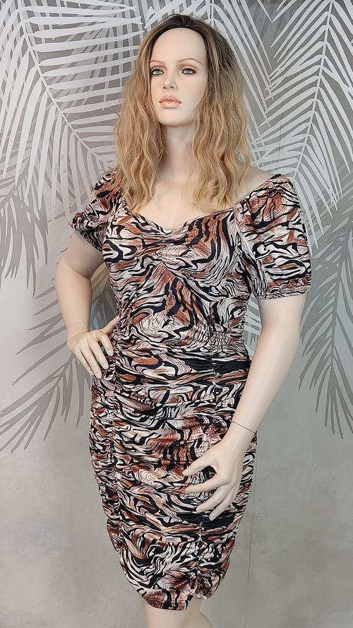 A barna, fekete, fehér és rozsdás árnyalatok az Ősz típusoknak állnak a legjobban, de a Tél színtípus is előnyösen viselheti a kontrasztos minták miatt. Magassarkú szandállal vagy klasszikus fekete magassarkúval párosítva igazán elegáns megjelenést biztosít. Egyszerű kiegészítőkkel hagyd, hogy a ruha mintája legyen a főszerepben.