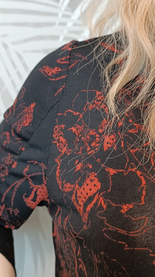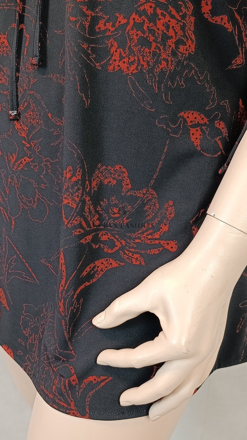 A fekete alapon futó mélypiros virágminta érzéki, mégis ízléses, a cipzáros részlet pedig modern, kicsit vagány hangsúlyt ad.