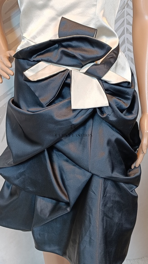 A szaténfényű anyag szépen tartja a formát, a strukturált derékrész és a masnis megoldás hangsúlyozza a női vonalakat, miközben kényelmes viselet marad.