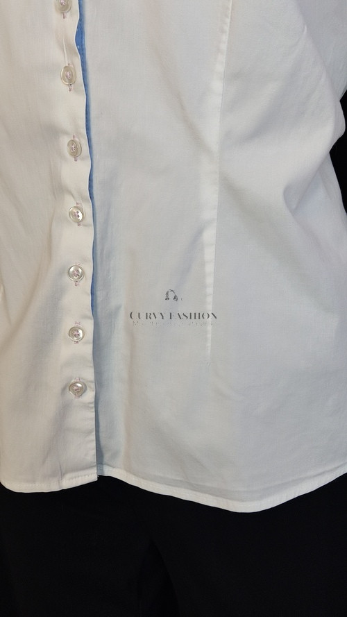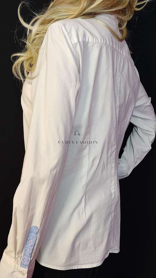 Klasszikus, letisztult és nőies. A fehér alap színvilág időtlen eleganciát sugall, míg a kontrasztos kék gallér és mandzsetta játékos, mégis ízléses megoldás.