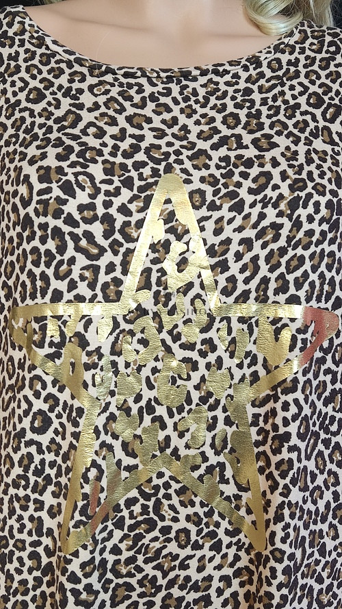 Trendi, fiatalos és vagány. Az állatmintás alap játékos, mégis erőteljes, az arany csillag pedig glamour hangulatot ad a felsőnek.