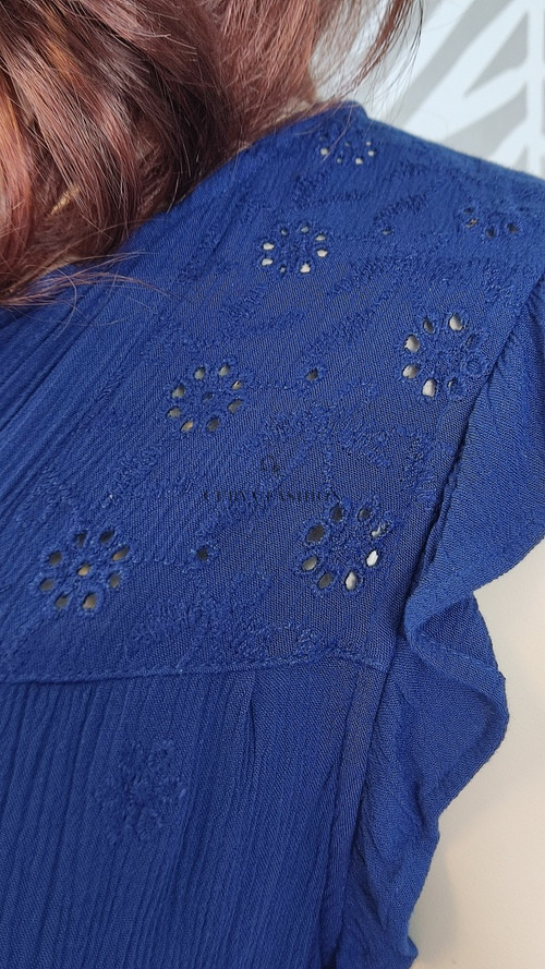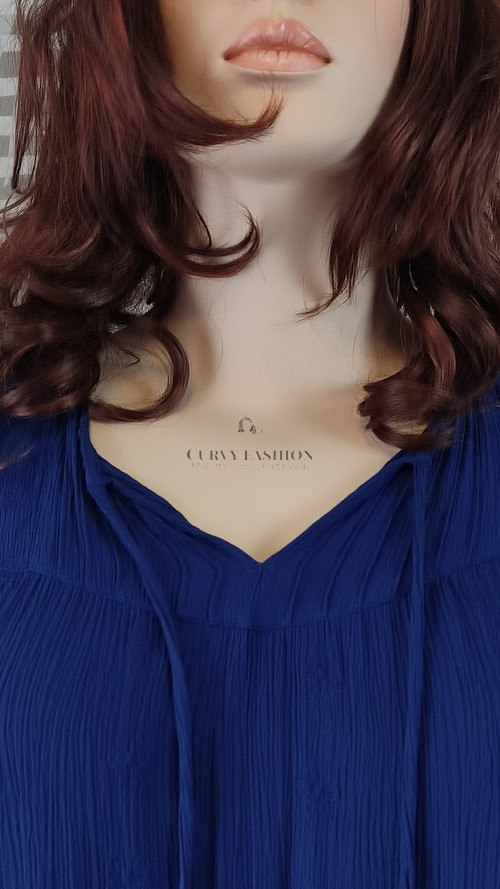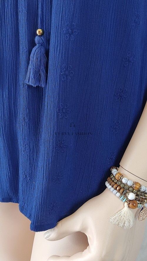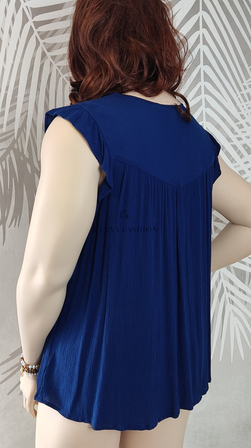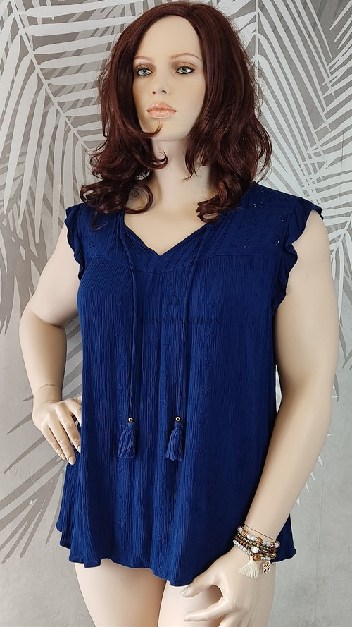 Ez a tengerészkék felső elegánsan kombinálja a laza szabást a finom részletekkel, így minden alkalomra tökéletes választás. A felső könnyed anyaga és bő szabása gondoskodik a kényelemről, míg az apró díszítő rojtok és az enyhén fodros ujjvég nőies bájt kölcsönöznek neki. A V-nyakú kivágás elegánsan hosszabbítja a nyakat, míg a finoman redőzött anyag lágy esést biztosít, ami minden testalkaton előnyösen mutat.