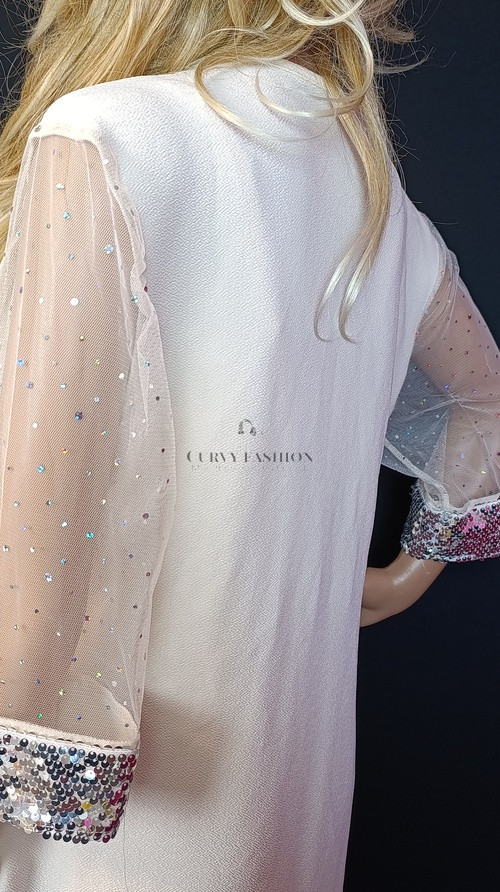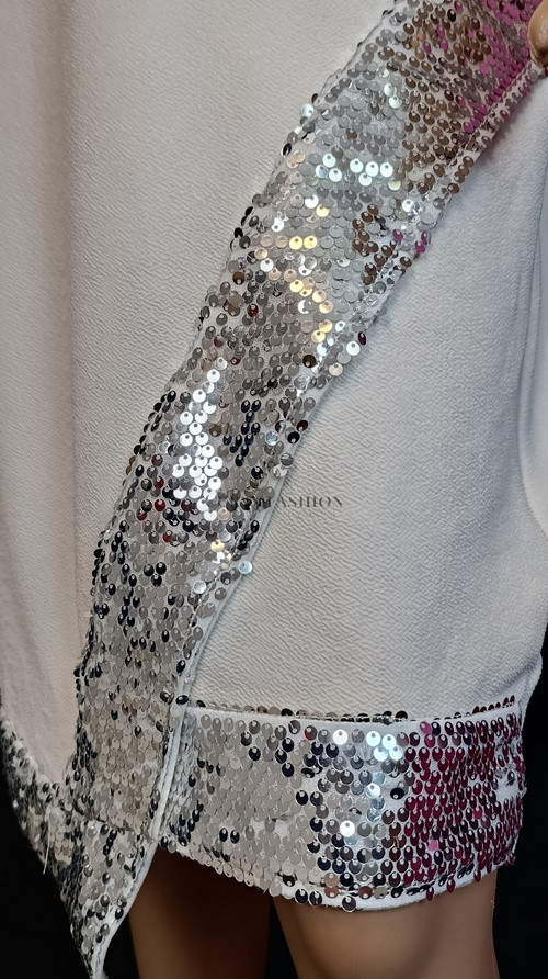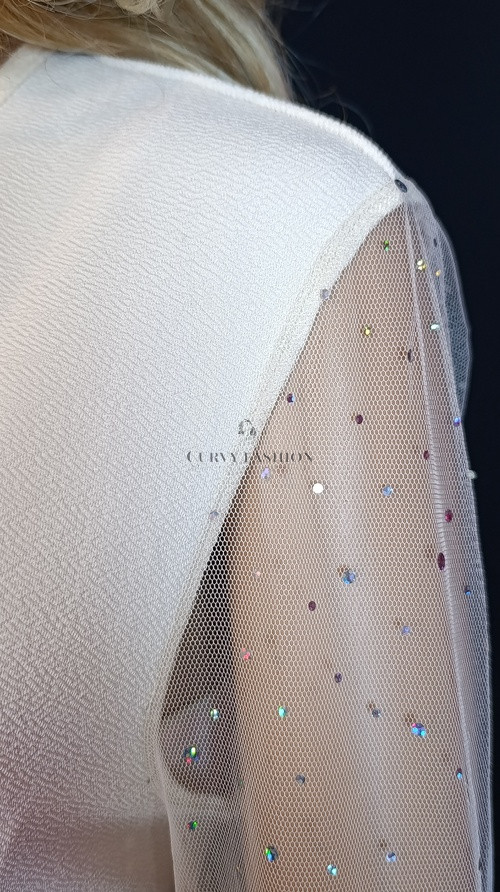 A fehér alapszínt ezüst flitteres részletek és áttetsző tüllujjak teszik különlegessé, így a megjelenés egyszerre romantikus és modern.