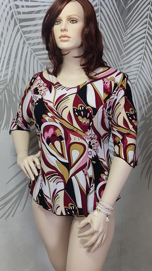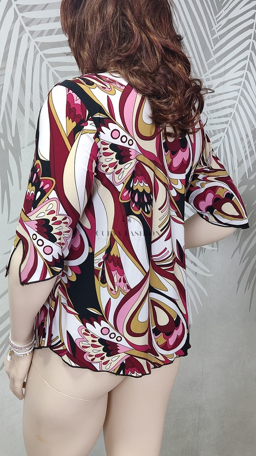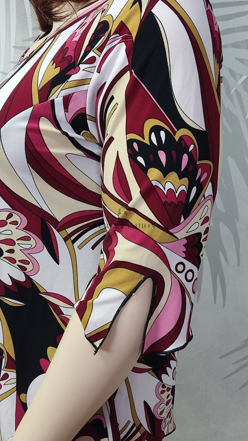 Ez a felső lenyűgöző mintáival és színeivel garantáltan feldobja megjelenésedet. A laza szabás biztosítja a kényelmet egész nap, míg a háromnegyedes ujjhossz ideális a tavaszi és őszi időjáráshoz. Az egyedi minták és a gazdag színek különleges megjelenést kölcsönöznek, amely biztosan vonzza a tekinteteket.