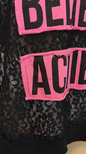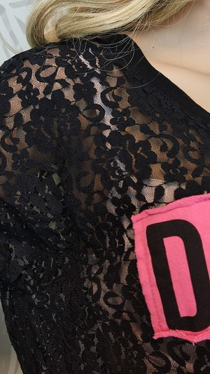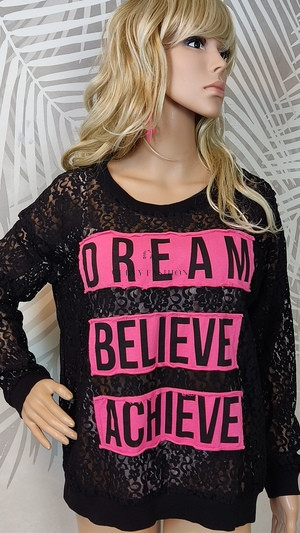 Laza szabású, rugalmas anyagból készült, amely kényelmet nyújt egész nap. A csipke mintázat és a kontrasztos felirat igazán trendivé és egyedivé teszi a megjelenésed.