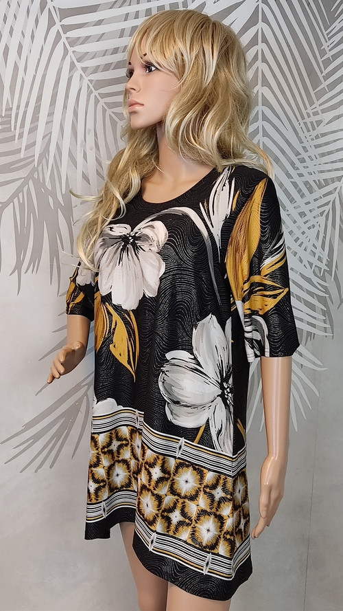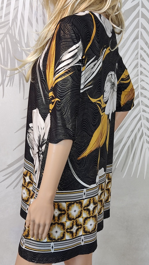 Elegáns és nőies, kissé bohém hangulatú tunika, amely a Kaleidoscope márkára jellemző igényes részletekkel készült. A virágmotívum romantikus, míg a fekete alap szofisztikált megjelenést ad.