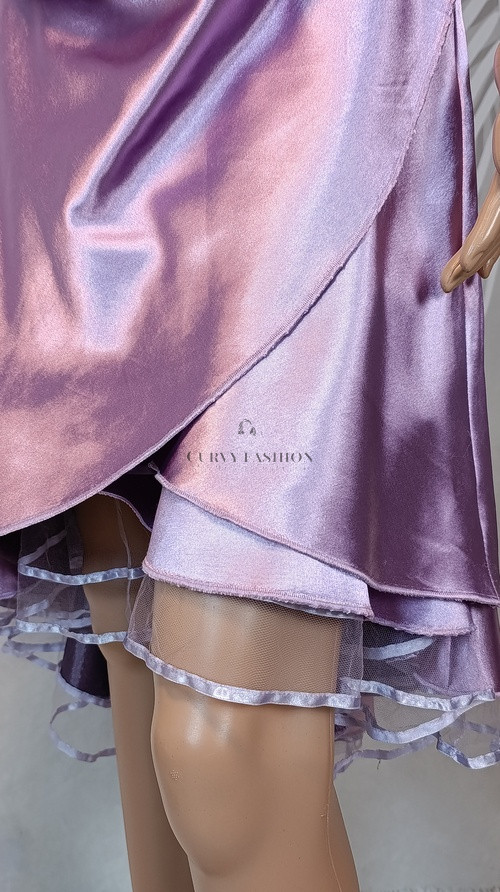 A puha, szaténfényű anyag lágyan omlik, a halterneck nyakkivágás és a mellrészen megjelenő masni szépen kiemeli a felsőtestet, miközben a réteges szoknyarész finoman takar és kényelmes mozgást enged.