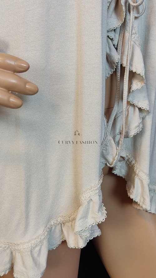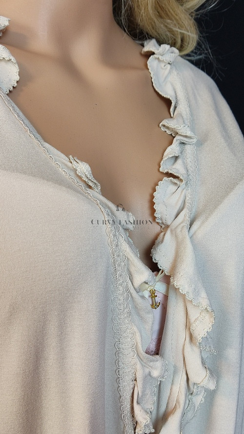 Romantikus és klasszikus megjelenés, amely a finom részletekre épít. A fodros szegély és a laza szabás könnyed nőiességet kölcsönöz, ideális azoknak, akik szeretik az elegáns, mégis kényelmes ruhadarabokat.