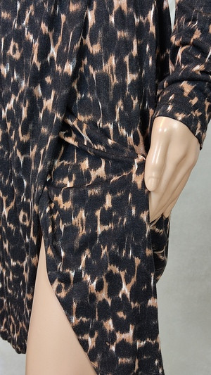 Ez a leopárdmintás ruha hosszan karcsúsított szabással készült, amely optikailag nyújtja az alakot, miközben a mély V-kivágás érzékiséget sugall. A hosszú ujjakkal kombinált szellős anyag elegáns és kényelmes viseletet nyújt.