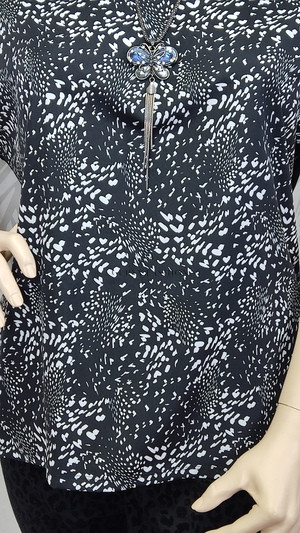 A felső lazább, bővebb szabása és visszafogott, fekete-fehér mintája elegáns és időtlen megjelenést biztosít. A lekerekített nyakkivágás és a rövid ujj kényelmes viseletet nyújt, amely tökéletesen alkalmas mindennapi használatra. Ez a darab nem csak kényelmes, de rendkívül stílusos is.