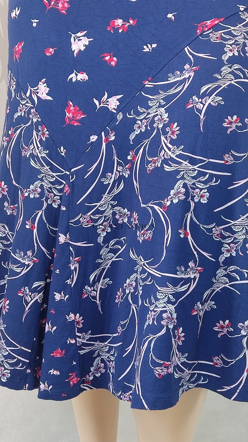 Nőies, lágy és harmonikus. A sötétkék alapon elhelyezkedő piros és fehér virágminta friss, tavaszias hatást kelt. A szoknya vonalvezetése klasszikus, mégis könnyed, ami elegánsan ringató mozgást kölcsönöz járás közben.