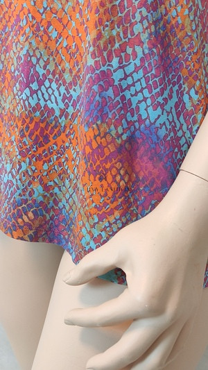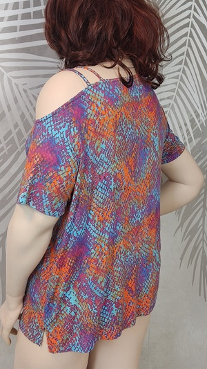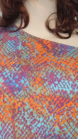 Az aszimmetrikus kialakítás és a csábító vállkivágás modern és laza hangulatot áraszt. A színes mintázat kiemeli viselőjét, tökéletes választás azoknak, akik szeretik a vidám és játékos darabokat.