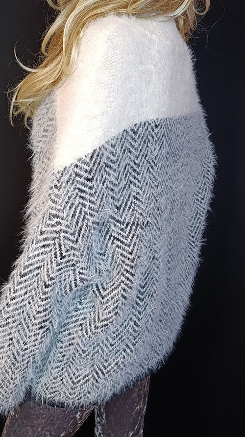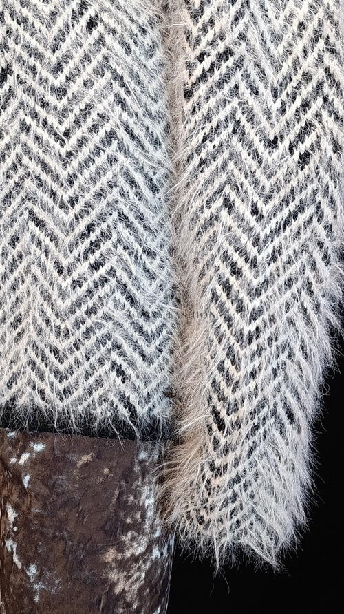 A laza szabás és a finoman szőrös kötött anyag kellemes meleget ad, miközben nem nehezíti el az alakot, hanem lágyan követi azt.