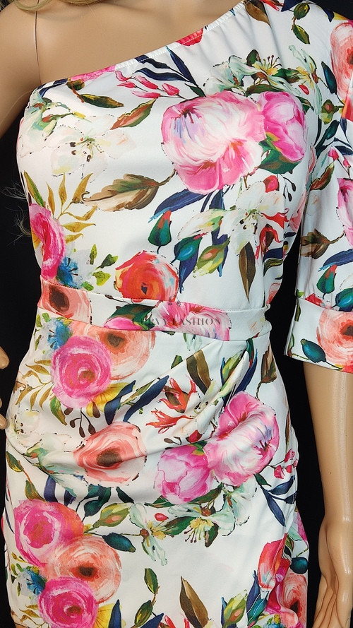 A fehér alap és a pink, piros, zöld színek kombinációja a Tavasz és Nyár színtípusok számára ideális, de a kontrasztos hatás miatt az Élénk Tél típusok is bátran viselhetik. Magassarkúval és elegáns kistáskával igazi alkalmi összeállítást hoz létre. Visszafogott ékszerekkel érdemes kombinálni, hogy a ruha mintája érvényesüljön.